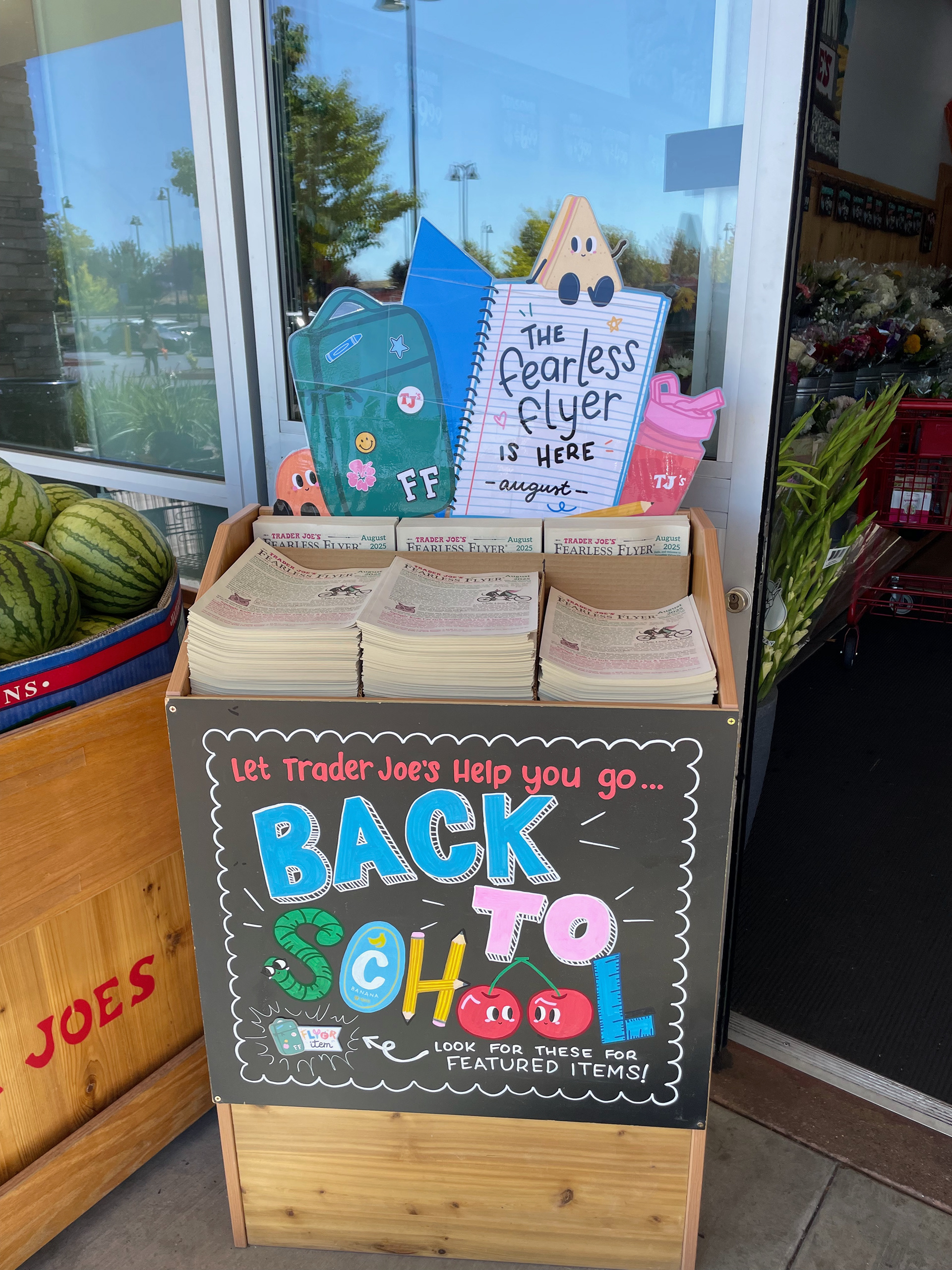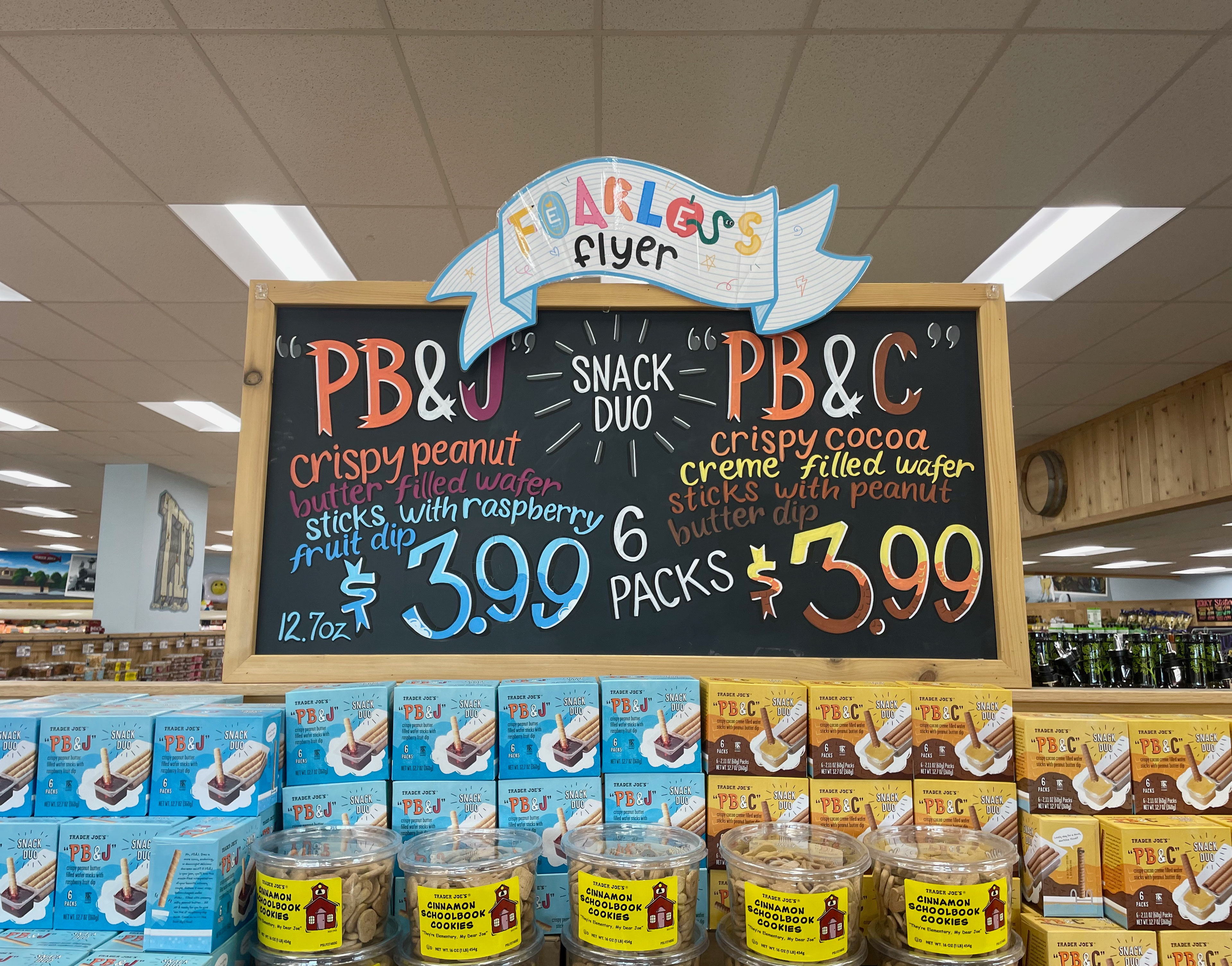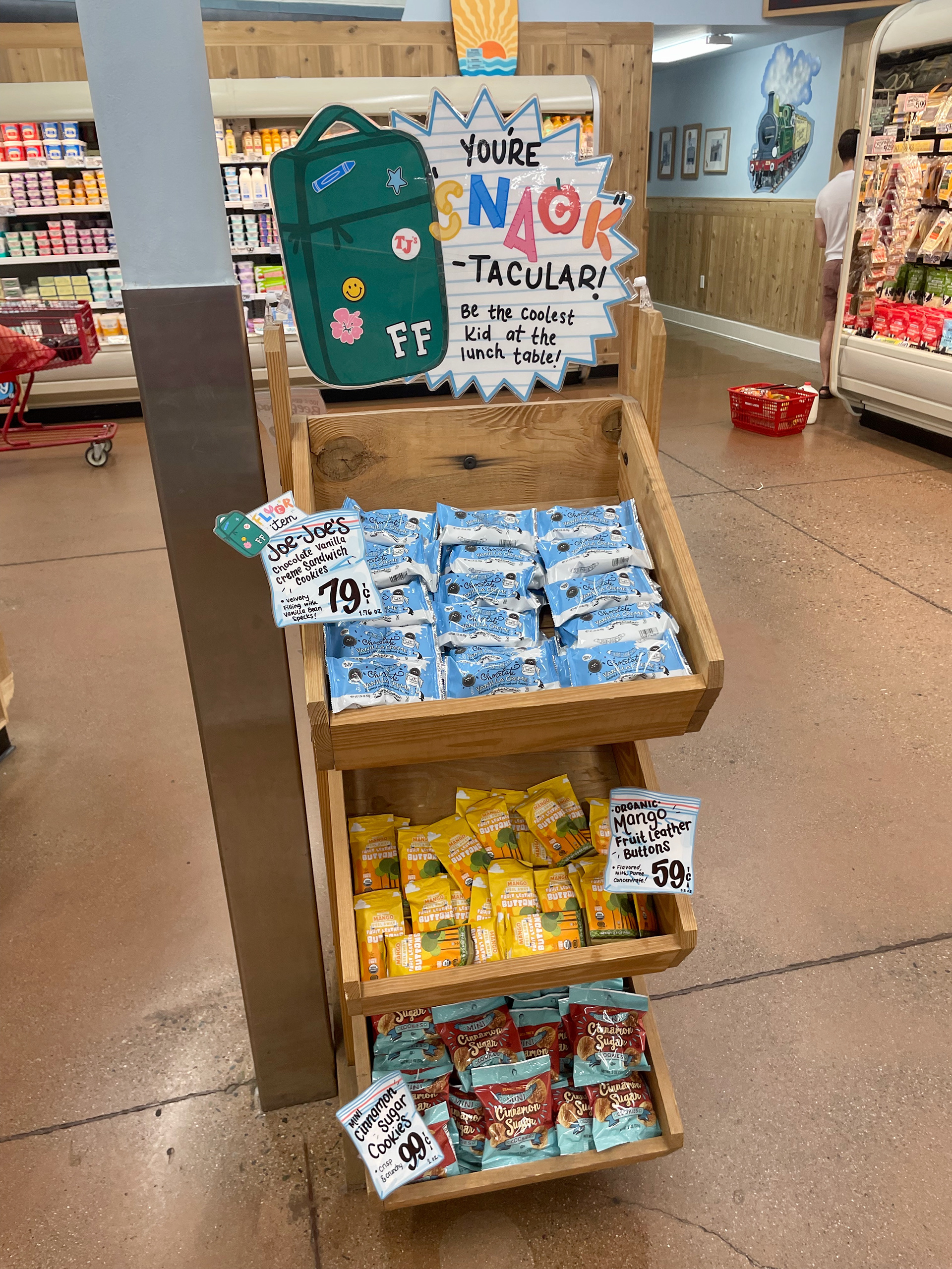 Displays created to advertise Trader Joe's Fearless Flyer throughout the store and feature special items. I created the main display, banners, item tags, and snack display, though was given the copy to include.