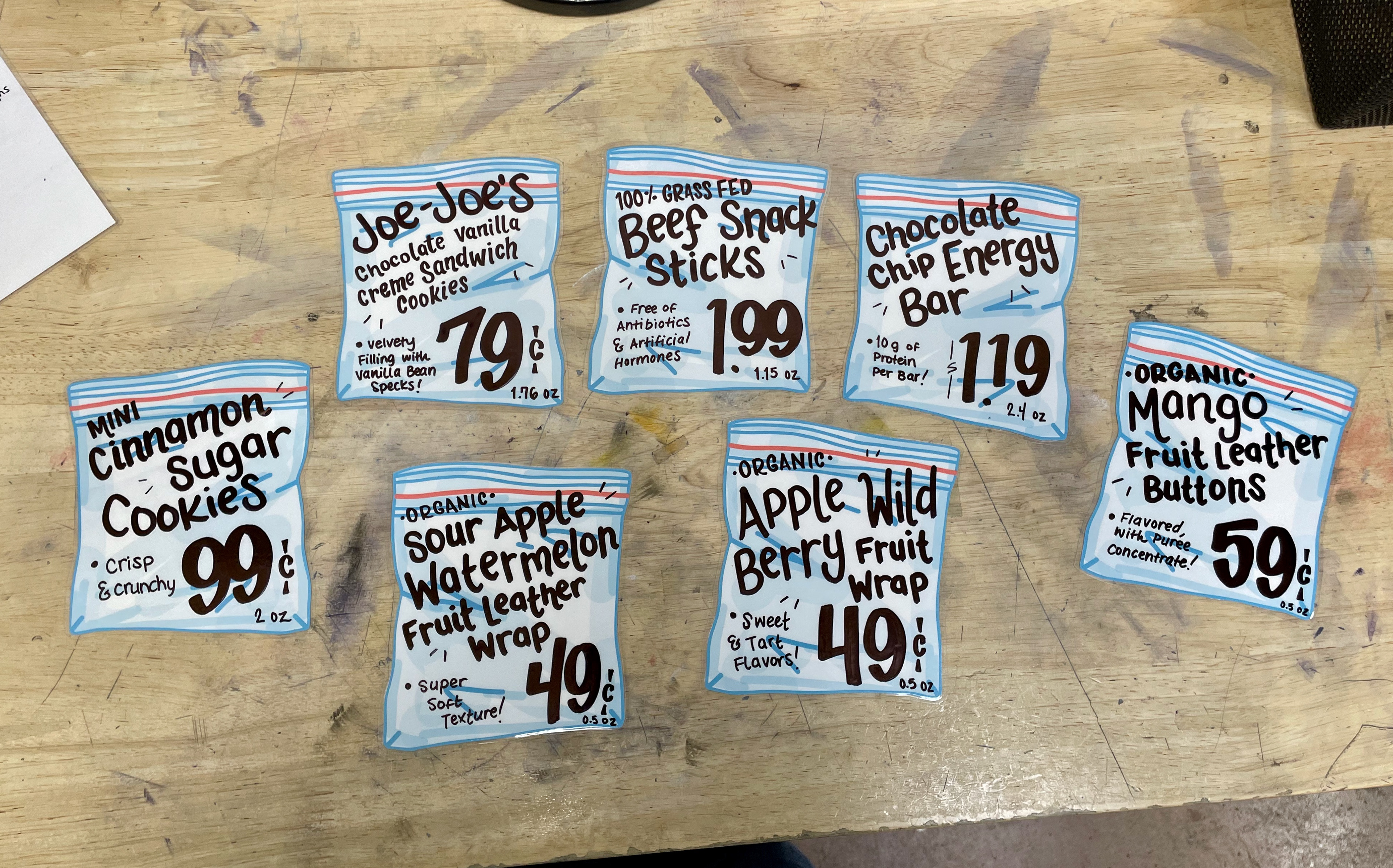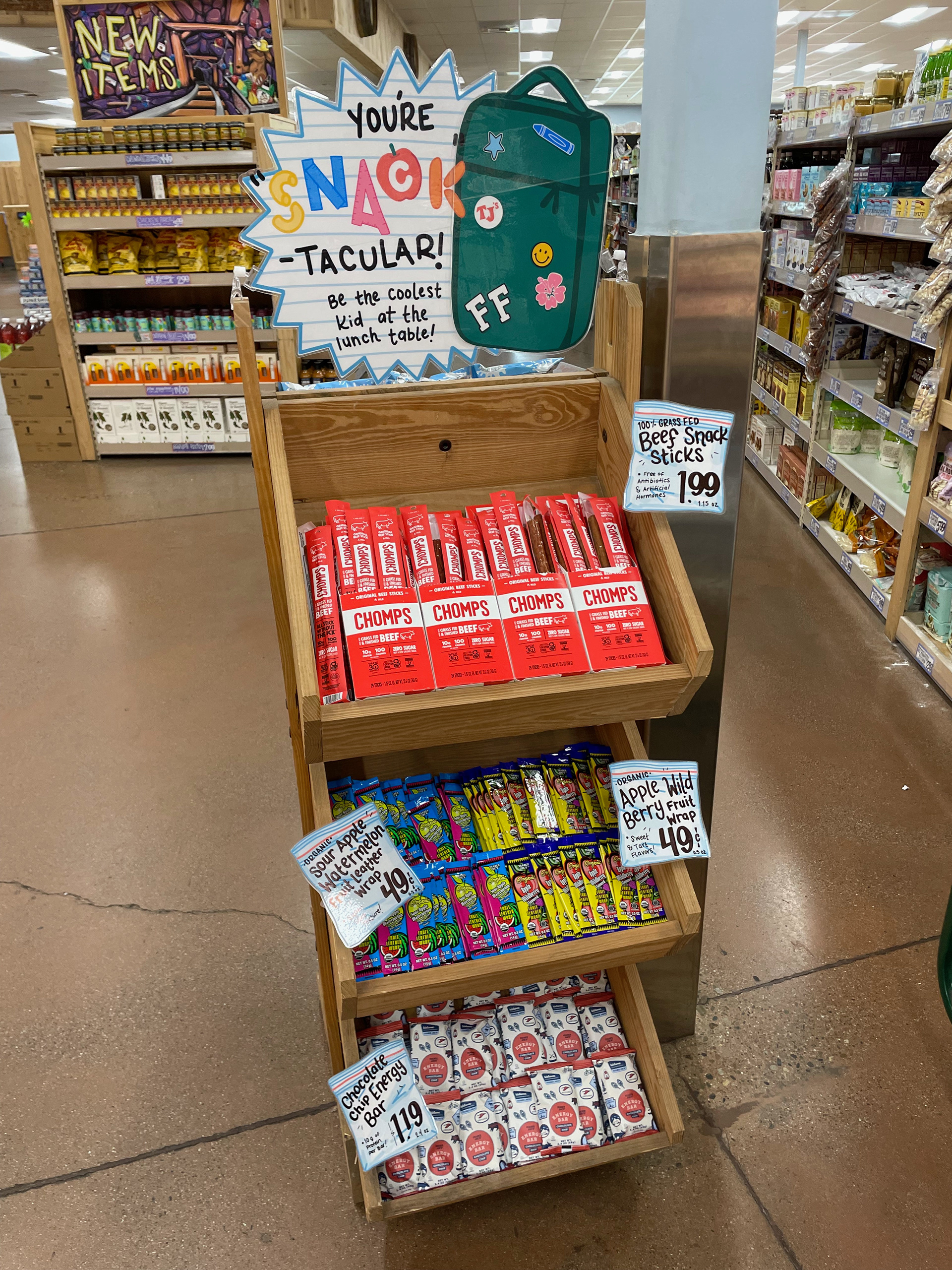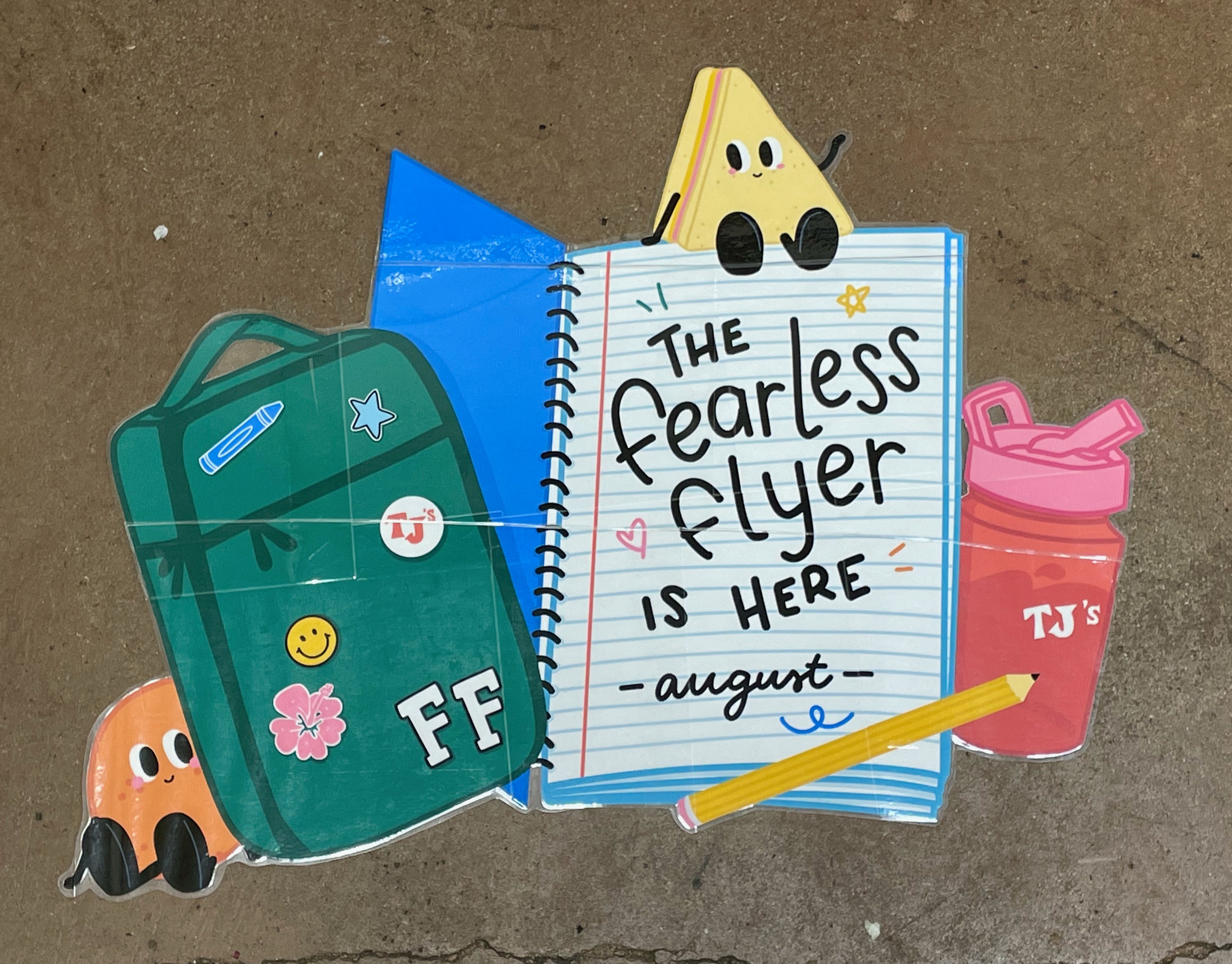 Displays created to advertise Trader Joe's Fearless Flyer throughout the store and feature special items. I created the main display, banners, item tags, and snack display, though was given the copy to include.